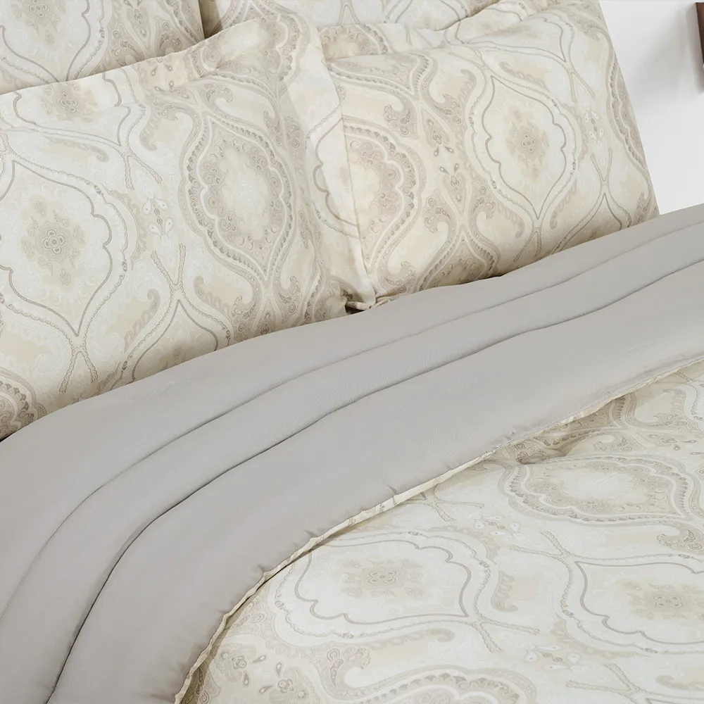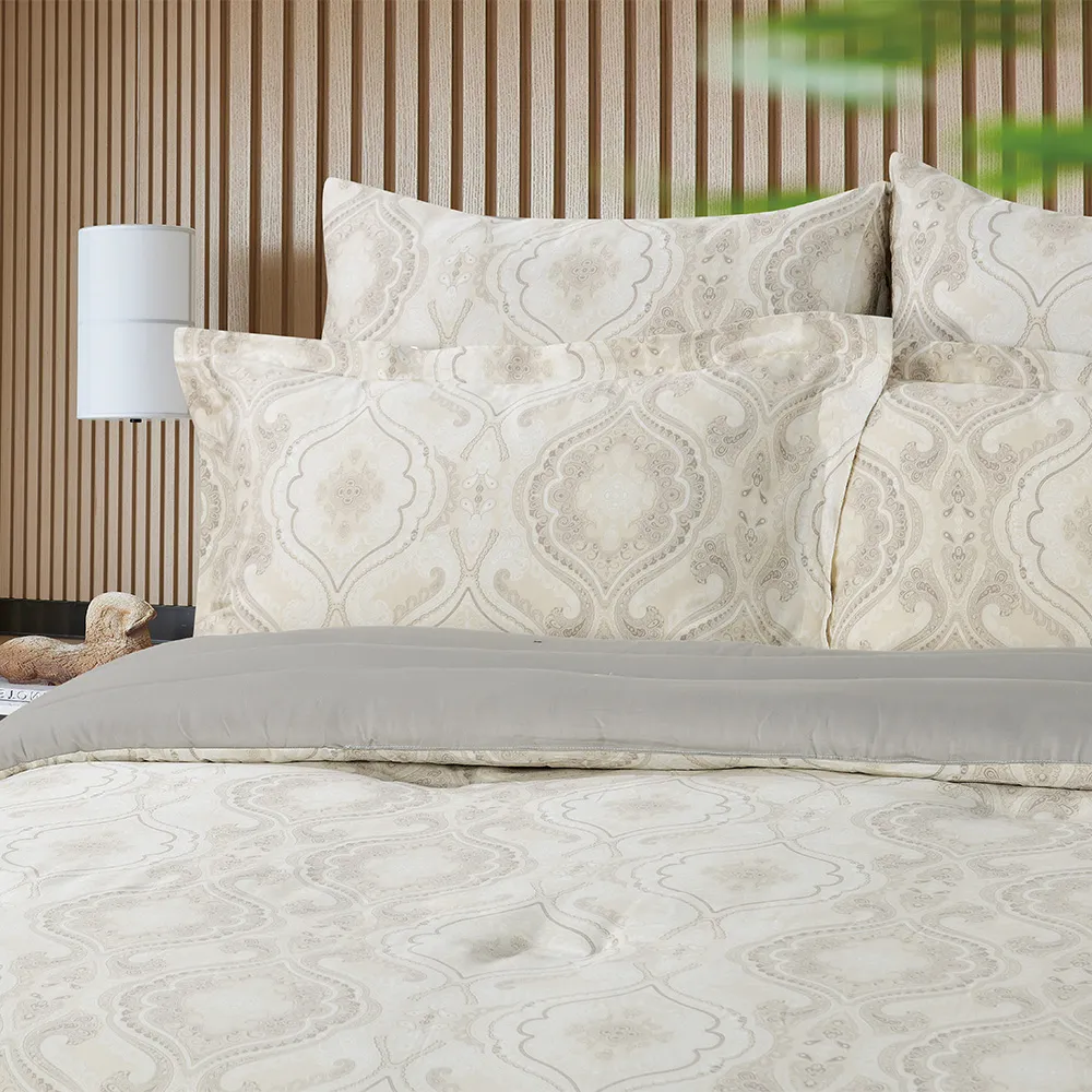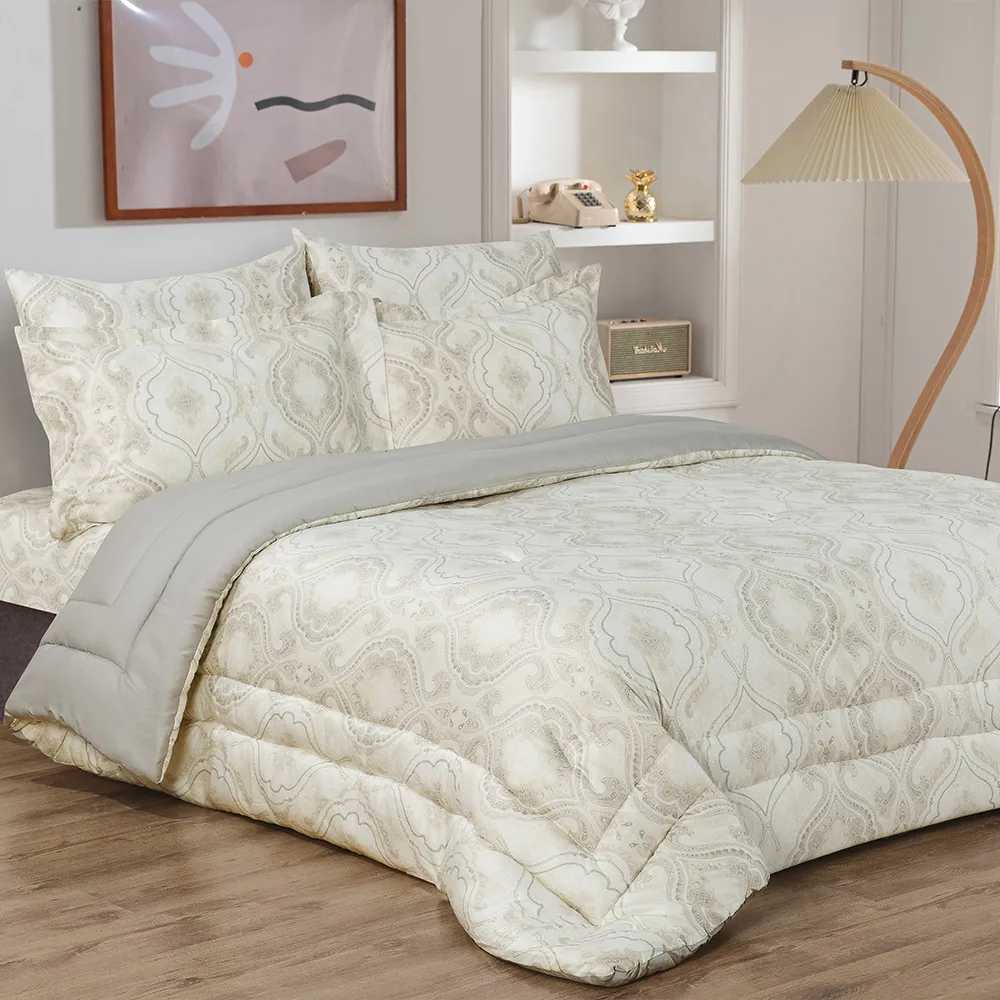 استمتع بالرّاحة المتجدّدة باختيارِك طقم اللحاف من القطن المصريّ والسّاتين. يضمن لك هذا الطقم المصنوع من القطن المصريّ ۱۰۰% الرّاحة طوال السّنة، ويحوّل سريرك إلى ملاذ للسّكينة. يُعدّ القطن المصريّ، المعروف بجَوْدته الاستثنائيّة، من بين أفضل أنواع القطن في العالم. وإلى جانب نعومته الفخمة، فإنّ أليافه طّويلة التّيلة تضمن المتانة الدّائمة، حيث أنّها تقاوم التّمزّق والتّكتّل. يتميّز طقم اللحاف فيلفي بتصميم تجريديّ يمزج الألوان بطريقة انسيابيّة، وهذا ما يمنح مظهرًا دائمَ الرّقيّ ويضيف لمسةً أنيقة وعصريّة إلى ملاذ نومك.