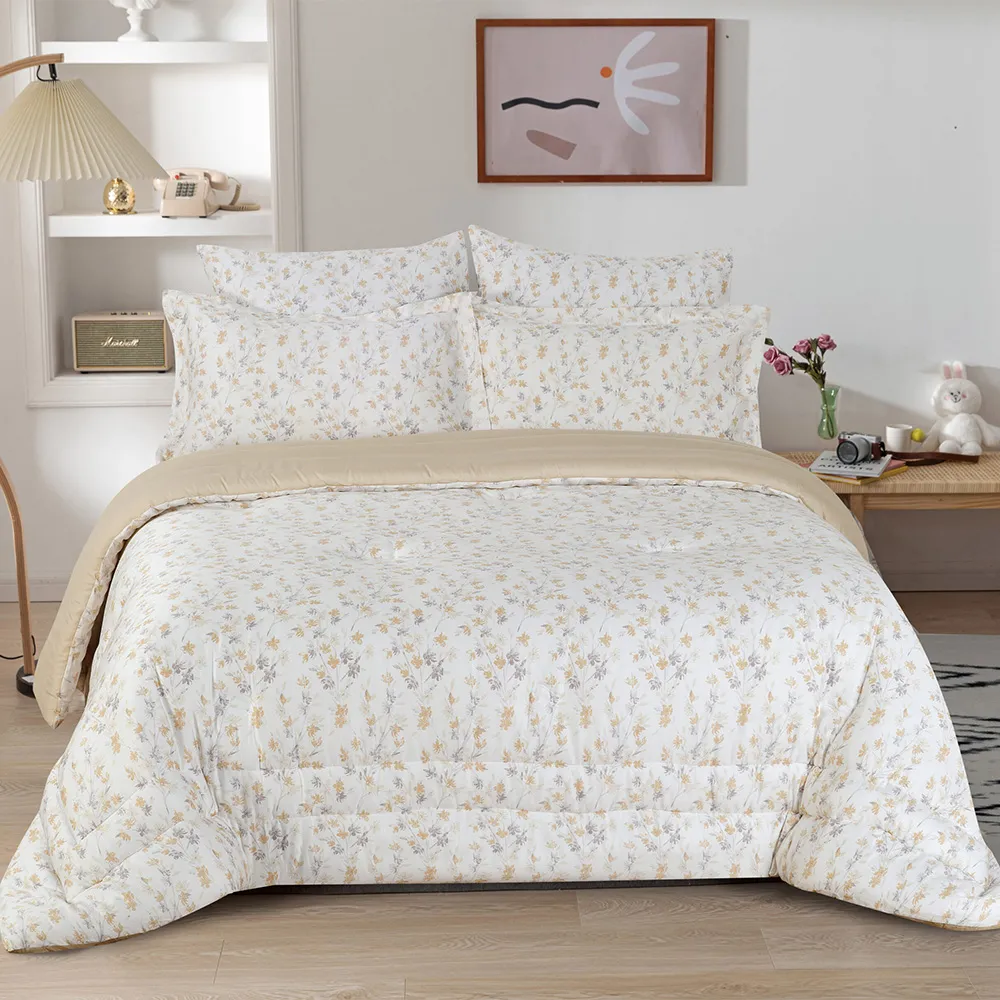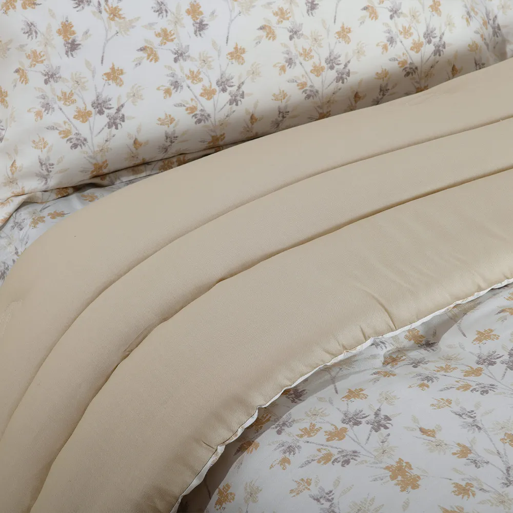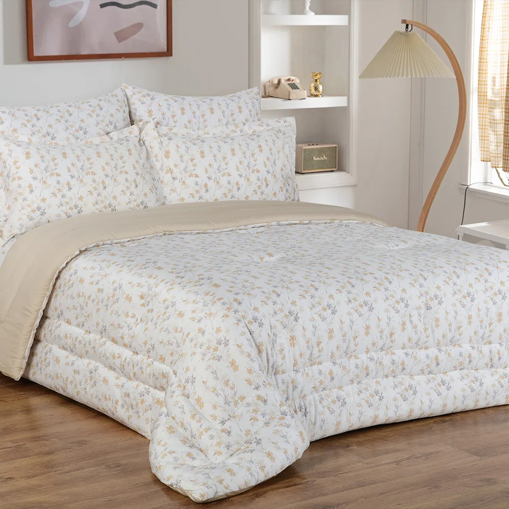 استمتع بالرّاحة المتجدّدة باختيارِك طقم اللحاف من القطن المصريّ والسّاتين. يضمن لك هذا الطقم المصنوع من القطن المصريّ ۱۰۰% الرّاحة طوال السّنة، ويحوّل سريرك إلى ملاذ للسّكينة. يُعدّ القطن المصريّ، المعروف بجَوْدته الاستثنائيّة، من بين أفضل أنواع القطن في العالم. وإلى جانب نعومته الفخمة، فإنّ أليافه طّويلة التّيلة تضمن المتانة الدّائمة، حيث أنّها تقاوم التّمزّق والتّكتّل. يدعوك طقم اللحاف ليليان إلى الدّخول إلى عالم من الرّومانسيّة والأنوثة، إذْ تُزيّن النّقوش الزّهريّة الطقم. كلّ نقْشَة زهريّة تهمس بنعومة لمسة الطّبيعة، لتضفيَ على مساحتكِ جمالًا.