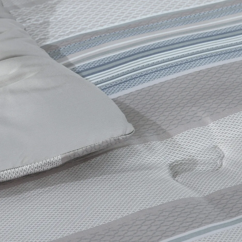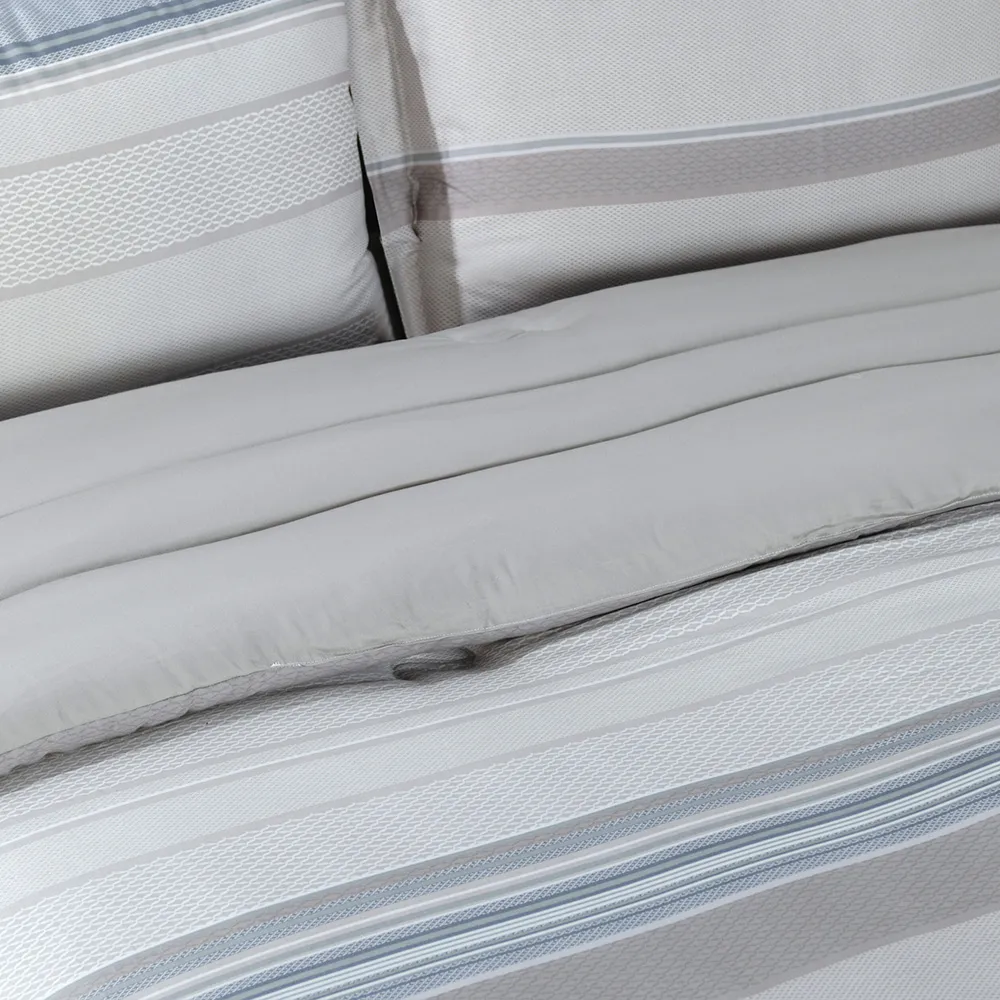 Immerse yourself in the rejuvenating comfort of our cotton sateen comforter set. This 100% Egyptian cotton comforter set keeps you comfortable year-round, transforming your bed into a haven of tranquility. Egyptian Cotton, renowned for its exceptional quality, is among the world’s finest. Beyond its sumptuous softness, its long-staple fibers ensure lasting durability, resisting tearing and piling. The Sorento set harmoniously blends muted colors in a horizontal stripe arrangement. The design evokes a relaxed and calming color scheme reminiscent of the tranquil serenity found in a summer sky.
